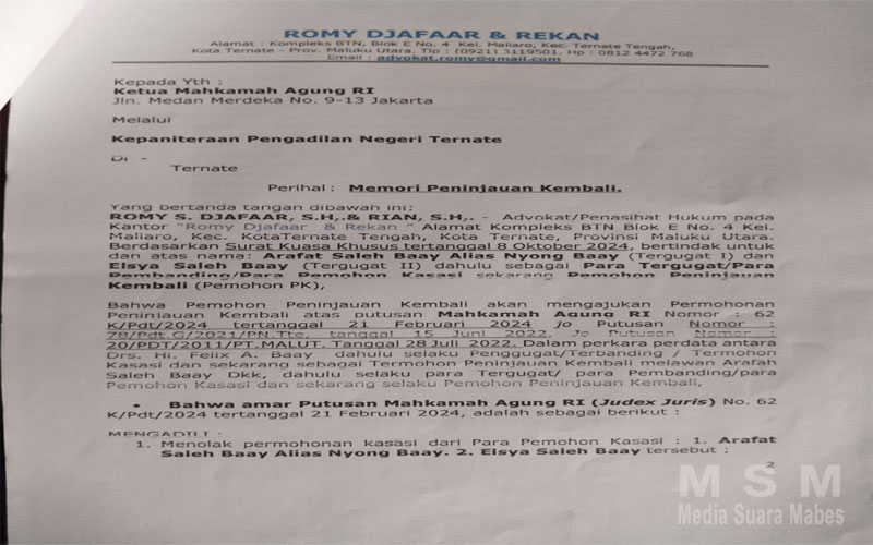 Rinno menuturkan keberatan sebagai penerus ahli waris dari Yorke Satrio Baay anak dari Alm.H.Saleh Umar Baay.minta Mahkamah Agung RI PK di kabulkan.nomor k/PDT/2024 tertanggal 21 februari 2024 Jo putusan Nomor 78/PDT.G/2021/PN.Tte tanggal 15 juni 2022 Jo Putusan Nomor 20/PDT/2011/PT.MALUT. (**Red)