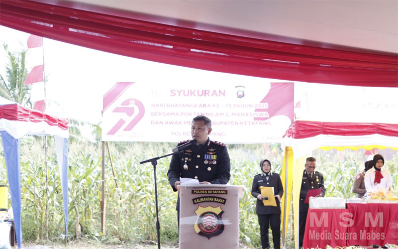 MediaSuaraMabes, Ketapang – Kepolisian Resor Ketapang menggelar kegiatan Syukuran Hari Bhayangkara ke-79 Tahun 2025, Pada Selasa (01/07/2025) Pukul 09.30 Wib. Kegiatan syukuran digelar secara serentak di lima lokasi yang berbeda yaitu di lokasi lahan jagung Desa Kali Nilam Kecamatan Delta Pawan dengan mengundang para petani, di lokasi Polsek Kawasan Pelabuhan Sukabangun dengan mengundang para buruh, di lokasi Markas Polair Polres Ketapang yang terletak di Desa Sukabangun Dalam dengan mengundang para nelayan, di lokasi Taman Kota Tanjungpura dengan mengundang petugas kebersihan serta di acara syukuran bersama santri di Komplek Pondok Pesantren Tahfizhul Quran Kecamatan Benua Kayong Kabupaten Ketapang.