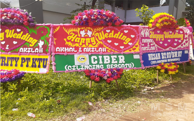 Ratusan tamu undangan yang terdiri dari keluarga, saudara, sahabat, serta warga sekitar turut hadir untuk memberikan doa restu kepada kedua mempelai. Deretan karangan bunga bertuliskan “Happy Wedding” tampak menghiasi area pesta, menambah semarak suasana.