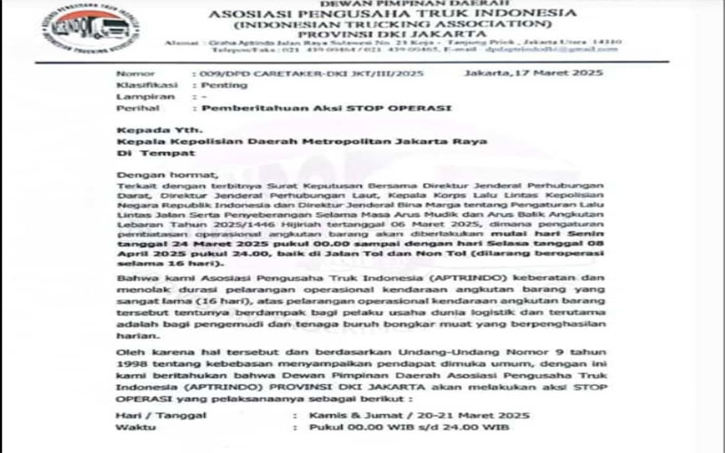 MajalahPerwira (Jaringan MSM), Jakarta – Asosiasi Pengusaha Trucking Indonesia (APTRINDO) DKI Jakarta menegaskan penolakan terhadap Surat Keputusan Bersama (SKB) yang diterbitkan oleh Dirjen Perhubungan Darat, Dirjen Perhubungan Laut, Korlantas Polri, dan Dirjen Bina Marga. SKB tersebut mengatur pembatasan operasional angkutan barang selama arus mudik dan balik Lebaran 2025. Berdasarkan SKB tertanggal 6 Maret 2025, pengaturan ini akan berlaku mulai hari Senin, 24 Maret 2025, pukul 00.00 WIB, hingga Selasa, 8 April 2025, pukul 24.00 WIB. Pembatasan ini mencakup jalur tol maupun non-tol, dengan larangan operasional angkutan barang selama 16 hari.