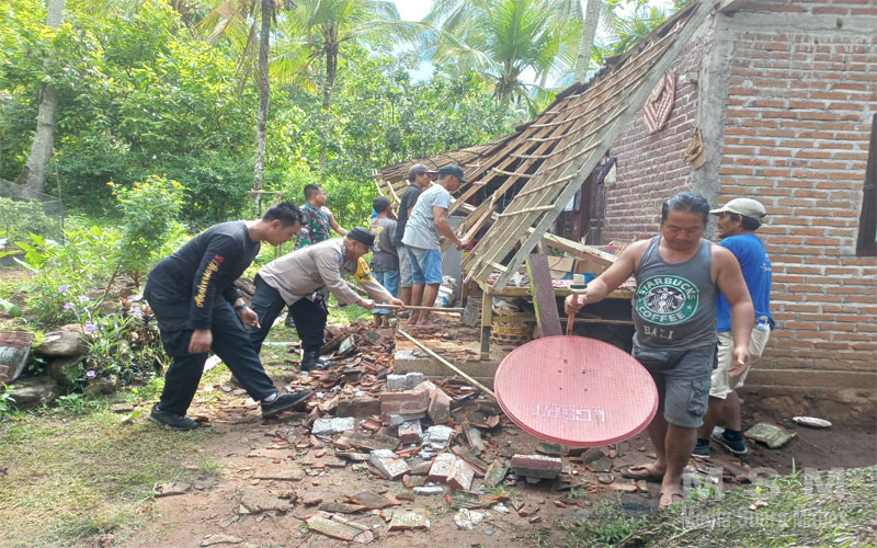 Selanjutnya warga pun ikut sibuk bergotong-royong dengan dibantu Bhabinkamtibmas Aiptu I Ketut Ardanayasa dan Babinsa yang turun bergabung bersama warga setempat untuk membersihkan reruntuhan emperan rumah warga yang roboh tersebut.