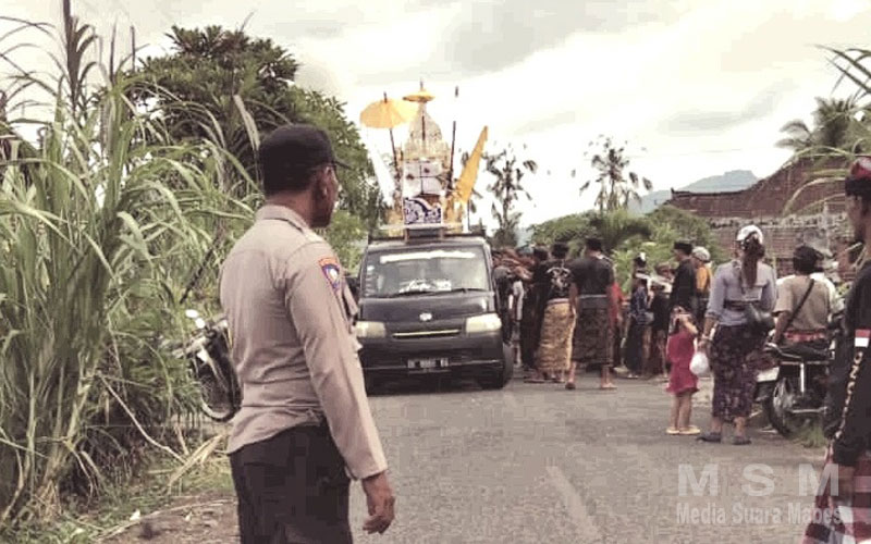 MajalahPerwira, Melaya Bali – Bhabinkamtibmas Desa Manistutu Polsek Melaya, Polres Jembrana, Polda Bali, Bripka I Ketut Suteja Astawa, dalam menjalankan tugasnya untuk mengawal setiap kegiatan masyarakat yakni pengawalan Pengabenan harus penuh dengan tanggung jawab.