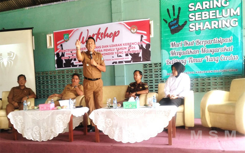 MajalahPerwira, Beltim – Kesbangpol Kabupaten Belitung Timur kembali menggelar Whork Shop dengan tema, Pencegahan Berita Hoaks dan Ujaran Kebencian dalam Menghadapai Era Pemilu Tahun 2024 Guna Terciptanya Situasi Kondisi yang Kondusif. Saring sebelum sharing ikut berpartisipasi menjadikan masyarakat Belitung Timur yang cerdas, acara dipandu oleh Fitra Agustian serta Nara sumber Yoyok Junaidi Kasi Intel Kejari Belitung Timur dan Ipda Syafira Rahmadani Kanit Tipikor Polres Beltim, bertempat di Fega cafee Manggar, Senen (4/12/2023).