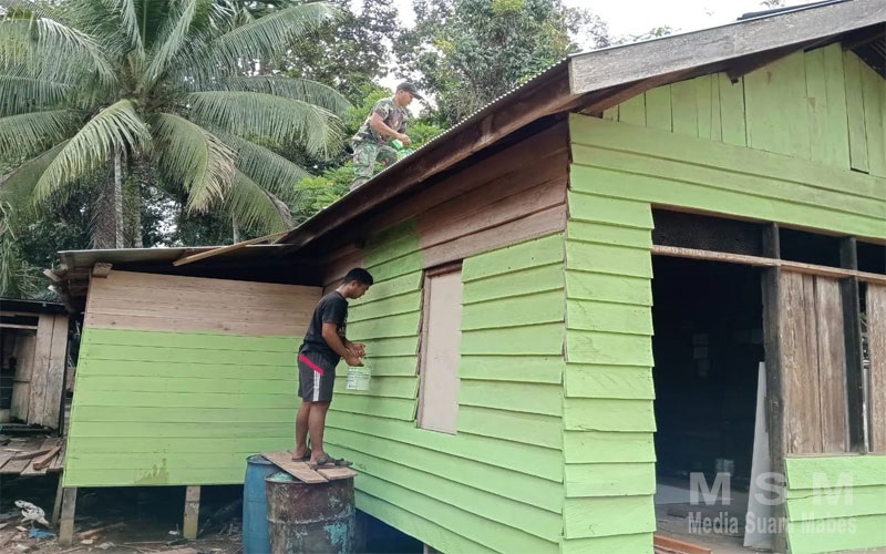 Secara konstruksi RTLH milik Pak Aseng sudah memasuki tahap pemasangan dinding rumah dan sekaligus pengecatan, boleh dikatakan sudah setengahnya selesai, ungkap Dansatgas melalui Koordintor rehab RTLH Kapten Inf Mulyono.