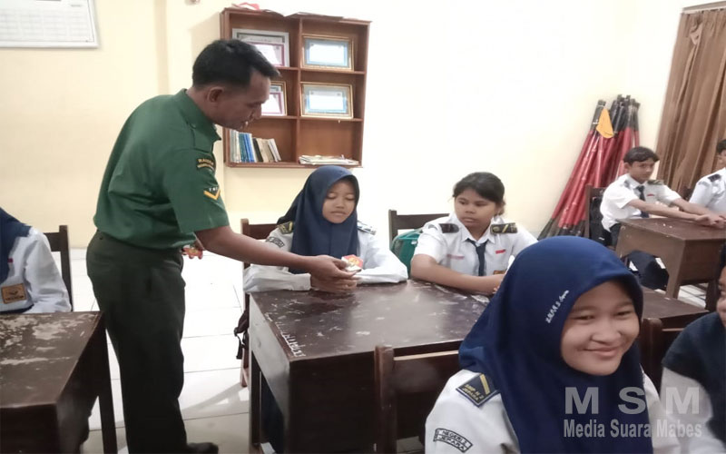 Disela-sela kegiatan tersebut Danramil Kapten Inf Ngadino bersama anggota membagikan leaflet kepada guru dan siswa-siswi SMPN 2 Jepara.