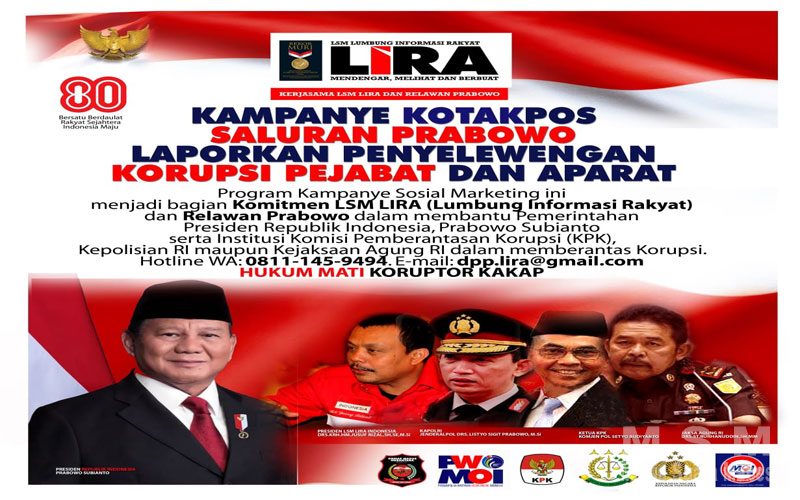 “Jika rakyat ingin bangkit makmur, adil dan sejahtera, serta ingin Indonesia maju, tidak ada pilihan lain rakyat harus bersatu melawan korupsi. Harus bersatu mendukung Presiden Prabowo Subianto melawan korupsi,” tegas Jusuf Rizal Presiden LSM LIRA dan Ketum Ormas Masyarakat Madura Asli (Madas) Nusantara itu