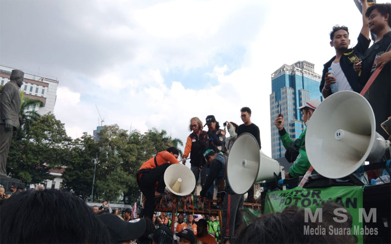 MediaSuaraMabes Jakarta – Unjuk rasa besar-besaran bertajuk “Aksi Akbar 205” yang digelar oleh para pengemudi ojek online (ojol) di kawasan Patung Kuda, Jakarta Pusat, berlangsung dengan penuh semangat dan diwarnai sejumlah aksi dramatis, termasuk insiden pembakaran ban di tengah jalan.