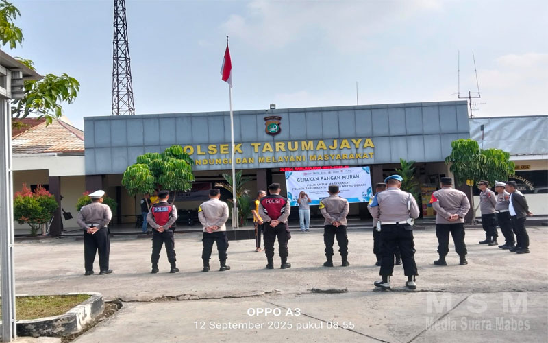 MediaSuaraMabes, Tarumajaya – Mapolsek Tarumajaya bersama Pemerintah Kabupaten Bekasi menggelar Gerakan Pangan Murah sebagai upaya menekan inflasi sekaligus membantu masyarakat dalam memenuhi kebutuhan pokok sehari-hari. Kegiatan tersebut berlangsung di halaman Mapolsek Tarumajaya, Jumat (12/September/2025).
