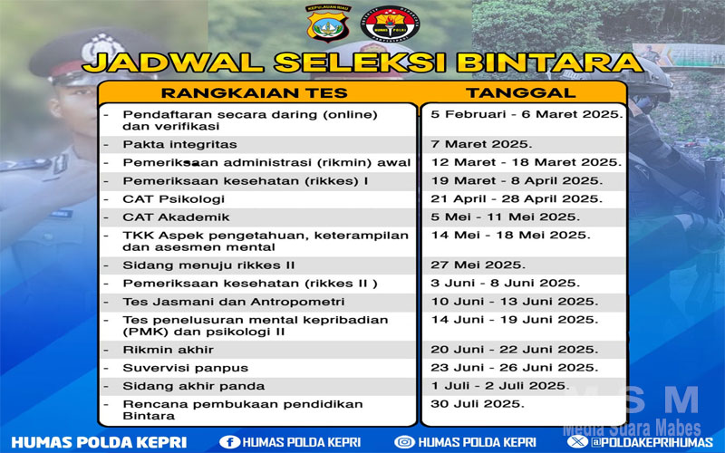 MajalahPerwira (Jaringan MSM), Batam – Polri membuka kesempatan bagi putra-putri terbaik bangsa untuk bergabung melalui seleksi penerimaan terpadu calon Taruna Akpol, Bintara, dan Tamtama Tahun Anggaran 2025. Proses rekrutmen ini dilaksanakan secara Bersih, Transparan, Akuntabel, dan Humanis (BETAH). Pendaftaran dibuka mulai 4 Februari hingga 6 Maret 2025 secara online, diikuti dengan tahapan seleksi di tingkat daerah (Panda) dan pusat (Panpus). Seluruh tahapan seleksi dilakukan dengan prinsip Clear and Clean, memastikan bahwa setiap calon anggota Polri yang terpilih memiliki kompetensi, integritas, dan kualitas terbaik. Berikut rincian tahapan seleksi untuk masing-masing kategori: