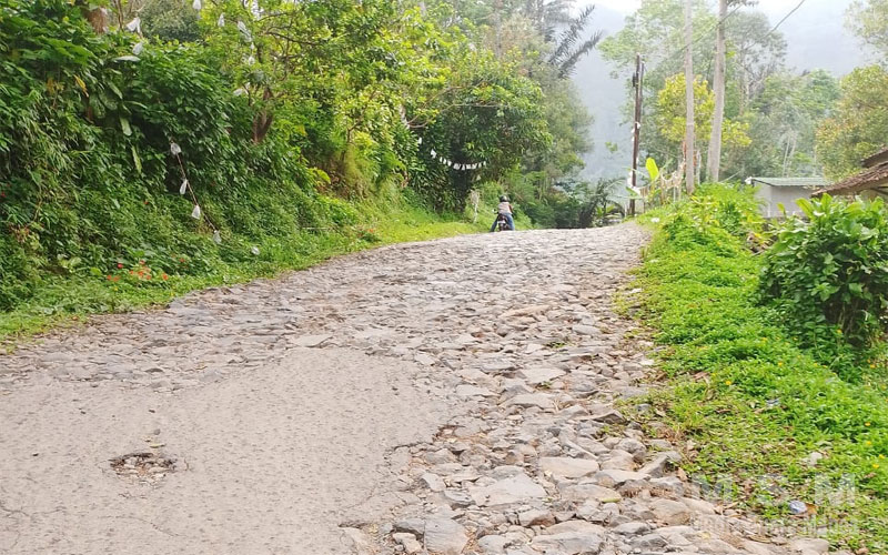 dan genangan air saat musim hujan, jalan tersebut sudah menjadi jalan bebatuan, mirip jalan kebo, permukaan jalan sangat tidak rata, Minggu 12 Oktober 2025.