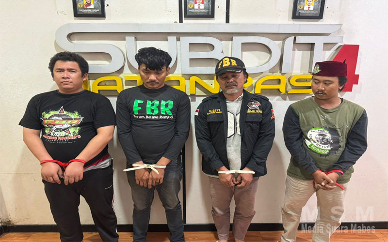 MediaSuaraMabes, Jakarta – Tim Jatanras Polda Metro Jaya menangkap Ketua Ormas Forum Betawi Rempug (FBR) Bojongsari dan empat anak buahnya terkait pemerasan pedagang dan toko-toko di Bojongsari, Depok, sejak 2021. Mereka memeras dengan modus menagih uang keamanan sambil mengancam dan mengintimidasi.