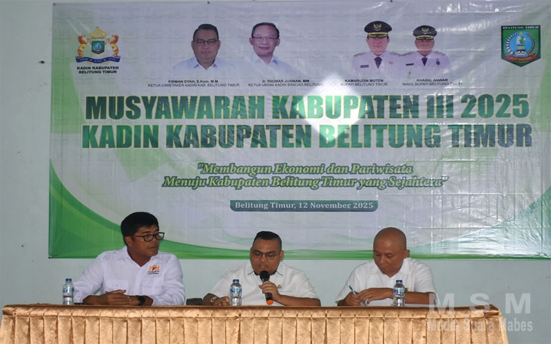 MediaSuaraMabes, Manggar Beltim – Asisten III Bidang Adminitrasi Umum, Ida Lismawati membuka Musyawarah Kabupaten (Muskab) Kamar Dagang dan Industri (KADIN) Kabupaten Belitung Timur III tahun 2025. Kegiatan yang berlangsung di Gedung Serba Guna Kantor Desa Padang Rabu 12 November 2025 ini untuk memilih Ketua dan Kepengurusan KADIN Kabupaten Beltim periode 2025 – 2030.
