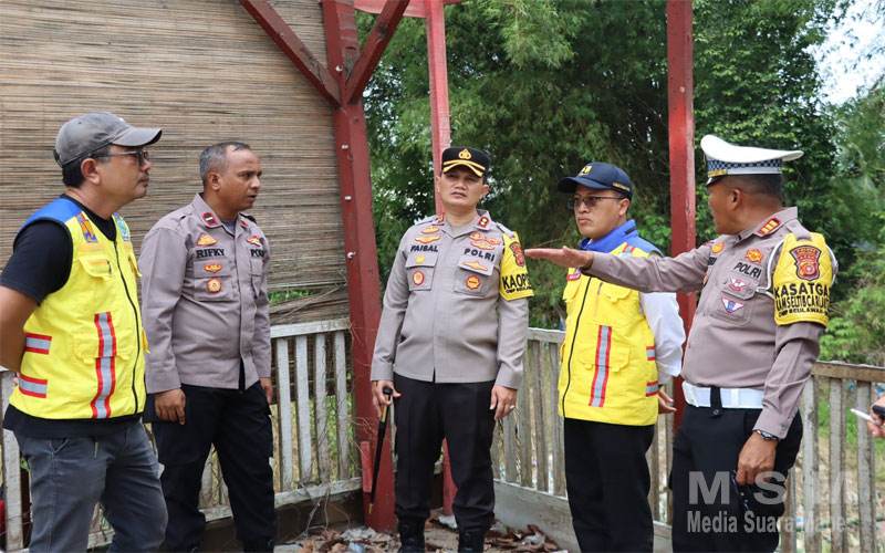 MajalahPerwira (Jaringan MSM), Pidie Jaya – Kapolres Pidie Jaya, AKBP Ahmad Faisal Pasaribu, S.H., S.I.K., M.H., turun langsung meninjau lokasi tanah longsor akibat abrasi Sungai Putu di Jl. Banda Aceh-Medan, tepatnya di Gampong Keude Lueng Putu, Kecamatan Bandar Baru, Kabupaten Pidie Jaya, Senin (6/1/2025) pukul 12.50 WIB.
