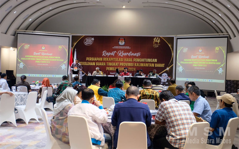 MajalahPerwira, Pontianak Kalbar – Kapolda Kalbar Irjen Pol Pipit Rismanto, S.IK.,M.H., yang diwakili oleh Karoops Polda Kalbar Kombespol Moch Noor Subchan,S.I.K.,M.H, beserta Dirintelkam Polda Kalbar Kombes Pol. Enggar Brotoseno, S.I.K, M.Si., menghadiri rapat dalam rangka persiapan rekapitulasi penghitungan cepat perolehan suara tingkat provinsi Kalimantan Barat, yang dilaksanakan oleh KPU Provinsi Kalimantan Barat bertempat di Hotel Mercure Pontianak pada hari Senin (4/3/2024)