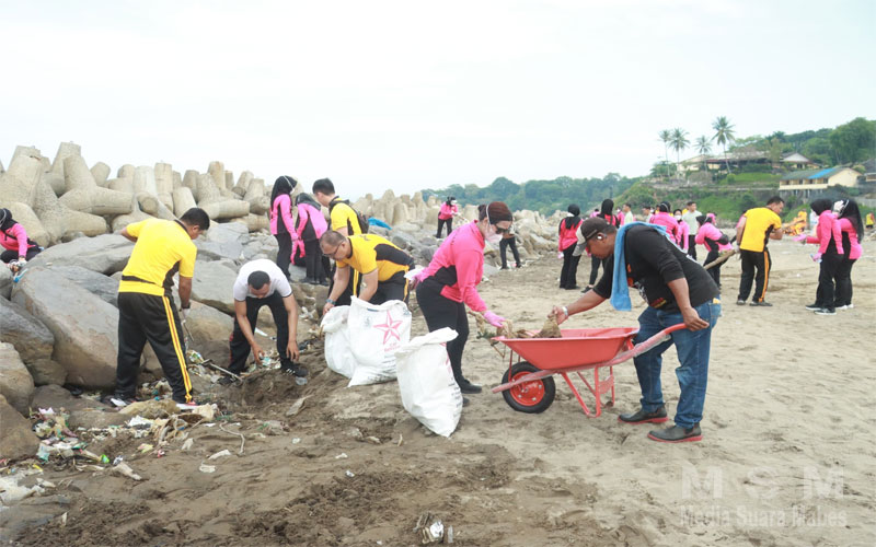 MediaSuaraMabes, Sukabumi – Sebagai bentuk kepedulian terhadap kelestarian lingkungan, Ketua Bhayangkari Daerah Jawa Barat Ny. Ges Akhmad Wiyagus bersama jajaran pengurus Bhayangkari Daerah Jawa Barat, Bhayangkari Cabang Sukabumi, serta Kapolres Sukabumi AKBP Dr. Samian, S.H., S.I.K., M.Si, seluruh anggota Polres Sukabumi, Serta Masyarakat sekitar pantai ikut melaksanakan kegiatan bersih-bersih pantai di sepanjang pesisir Pantai Gadobangkong hingga Dermaga Palabuhanratu, Jumat (11/04/2025).