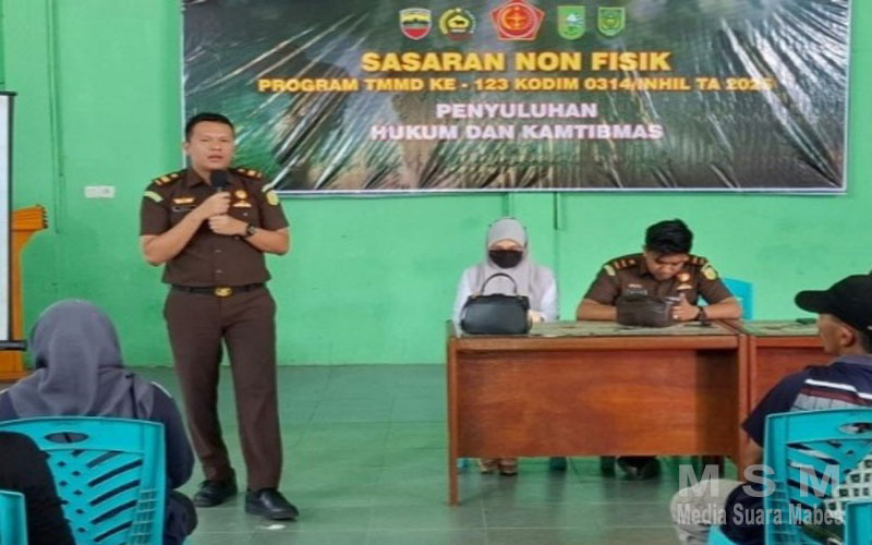 MajalahPerwira (Jaringan MSM), Kab. Indragiri Hilir – Dalam rangka mendukung program sasaran non-fisik TNI Manunggal Membangun Desa (TMMD) ke-123, Kodim 0314/Inhil menggelar penyuluhan hukum dan keamanan serta ketertiban masyarakat (Kamtibmas). Kegiatan ini berlangsung di Gedung Serba Guna “Tuah Negri”, Desa Mumpa, Kecamatan Tempuling, Kabupaten Indragiri Hilir (Inhil), dengan menghadirkan pemateri dari Kejaksaan Negeri (Kejari) Inhil.