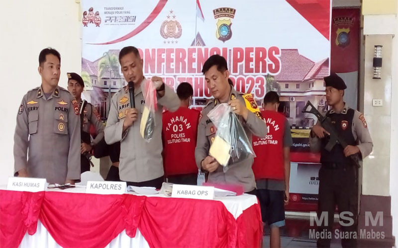 MajalahPerwira, Beltim – Polres Beltim konferensi Pers dipenghujung punutupan Akhir tahun 2023, bertempat di aula gedung pertemuan polres Beltim, Kapolres Belitung Timur AKBP Arif Kurniatan S.I.K.,MM, kasi Humas Jerey dan Kabag OPS Yamdrie, adapun menyangkut semua kejadian pelanggaran hukum sudah rata rata diselesaikan, 4 tersangka saat ini adalah terkait pelanggaran narkoba. Rabu (27/12/2023).