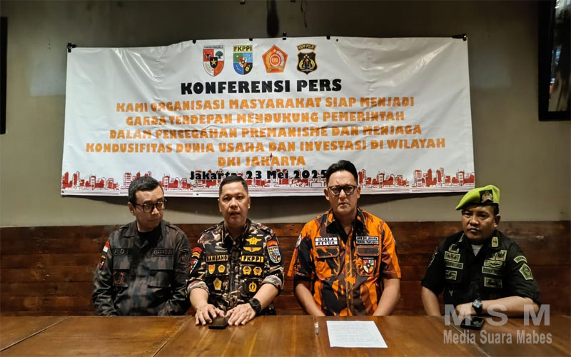 MediaSuaraMabes, Jakarta — Empat organisasi masyarakat besar di DKI Jakarta—Pemuda Pancasila, Forum Komunikasi Putra-Putri Purnawirawan TNI – POLRI (FKPPI), Keluarga Besar Putra Putri Polri (KBPP Polri), dan Pemuda Panca Marga—menggelar konferensi pers bersama sebagai bentuk komitmen nyata mereka dalam mendukung pemerintah menciptakan iklim usaha dan investasi yang aman, serta menolak keras segala bentuk premanisme.