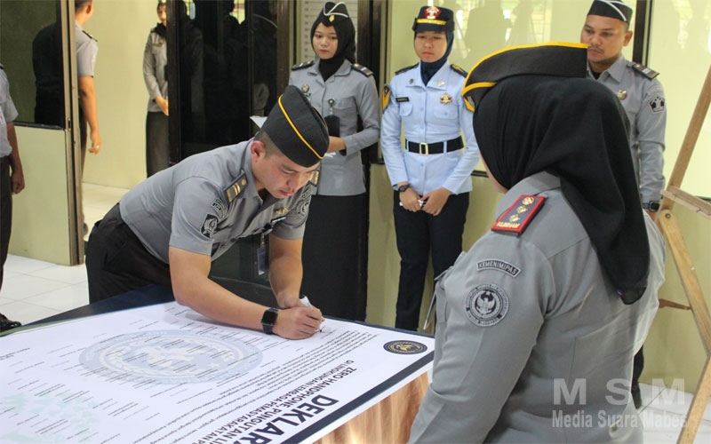 MediaSuaraMabes, Sigli – Lembaga Pemasyarakatan (Lapas) Perempuan Kelas IIB Sigli hari ini, Selasa (29/07) secara resmi mendeklarasikan dan menandatangani komitmen bersama “Zero HALINAR” (Handphone, Pungutan Liar, dan Narkoba). Deklarasi yang dipimpin langsung oleh Kepala Lapas Perempuan Kelas IIB Sigli, Yuliana diikuti oleh pejabat struktural dan seluruh pegawai Lapas Perempuan Kelas IIB Sigli.