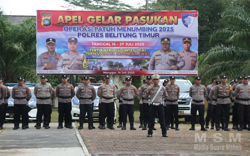MediaSuaraMabes, Babel – Polres Belitung Timur melaksanakan Gelar Pasukan Operasi Patuh Menumbing 2025 yang dipimpin oleh Kapolres Belitung Timur AKBP Indra Feri Dalimunthe, S.H., S.I.K., M.H., di Halaman Depan Mapolres Belitung Timur, Senin (14/7/2025).