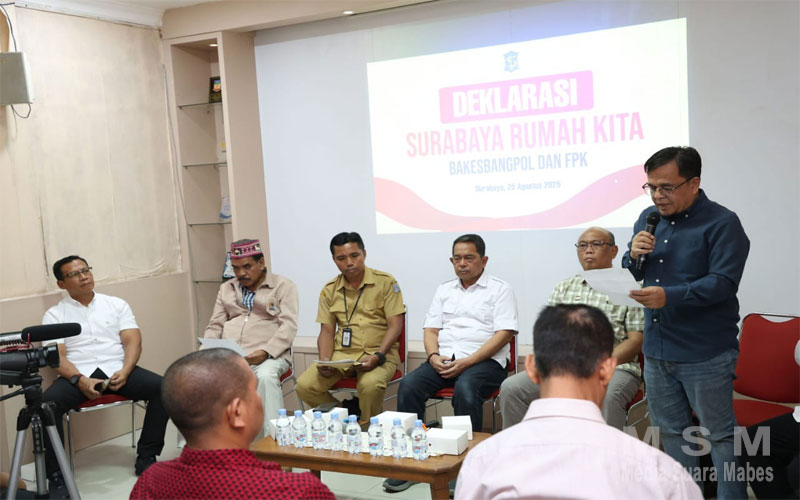 MediaSuaraMabes, Surabaya – Sebagai bentuk kepedulian dan rasa tanggung jawab, Pemerintah Kota (Pemkot) Surabaya melalui Badan Kesatuan Bangsa dan Politik (Bakesbangpol) bersama Forum Pembauran Kebangsaan (FPK) Kota Surabaya yang berkomitmen menjaga persatuan dan kesatuan antar kelompok masyarakat di Kota Surabaya dengan mewujudkan deklarasi yang bertajuk “Surabaya Rumah Kita Bersama” dimana disepakati oleh 27 suku di Surabaya, Senin (25/8/2025), di Gedung Eks Humas Pemkot Surabaya.