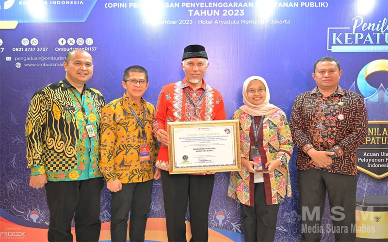 MajalahPerwira, Jakarta – Pemerintah Provinsi Sumatera Barat (Pemprov Sumbar), menembus jajaran enam besar provinsi dengan Penilaian Kepatuhan Penyelenggaraan Pelayanan Publik tertinggi tahun 2023. Penghargaan atas capaian tersebut diterima Gubernur Sumbar, Mahyeldi Ansharullah, dari Ombudsman RI di Aryaduta Hotel, Jakarta Pusat, Kamis (14/12/2023).