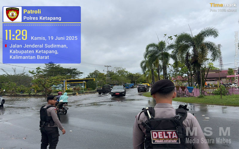 MediaSuaraMabes, Ketapang – Personel Satuan Samapta Polres Ketapang melaksanakan patroli rutin pada Kamis (19/6) dengan memberikan bantuan kepada masyarakat yang mengalami kendala di jalan raya akibat genangan air. Hujan yang mengguyur wilayah Kabupaten Ketapang sejak malam hingga pagi hari menyebabkan beberapa ruas jalan di dalam kota tergenang air dengan ketinggian mencapai sekitar 30 sentimeter.