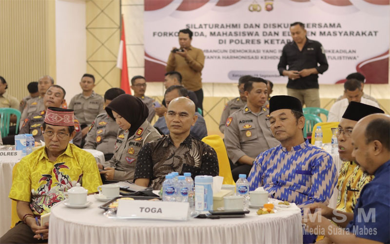 MediaSuaraMabes, Ketapang Kalbar – Kepolisian Daerah (Polda) Kalimantan Barat menggelar acara silaturahmi dan diskusi yang dihadiri oleh berbagai elemen masyarakat di Masjid An Nur Komplek Mapolda Kalbar. Acara yang mengusung tema ” Membangun Demokrasi Yang Inklusif Dan Berkeadilan Demi Terciptanya Harmonisasi Kehidupan Di Bumi Khatulistiwa,” ini juga diikuti Polres jajaran termasuk Polres Ketapang yang mengikuti melalui siaran online zoom meeting di Aula Mapolres Ketapang, Jumat (19/09/2025) Pukul 08.00 Wib.