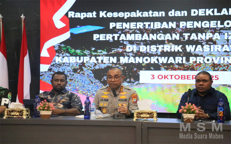 MediaSuaraMabes, Manokwari Papua Barat – Kepolisian Daerah Papua Barat menunjukkan keseriusan dalam menangani aktivitas Pertambangan Tanpa Izin (PETI) yang marak terjadi di Distrik Wasirawi, Kabupaten Manokwari. Langkah konkret itu diwujudkan melalui kehadiran Kapolda Papua Barat Irjen Pol Johnny Eddizon Isir, S.I.K., M.T.C.P., pada Rapat Kesepakatan dan Deklarasi Bersama Penertiban Pengelolaan Pertambangan Tanpa Izin (PETI) yang berlangsung di Aula Sasana Karya, Kantor Bupati Manokwari, Jumat (3/10/2025).