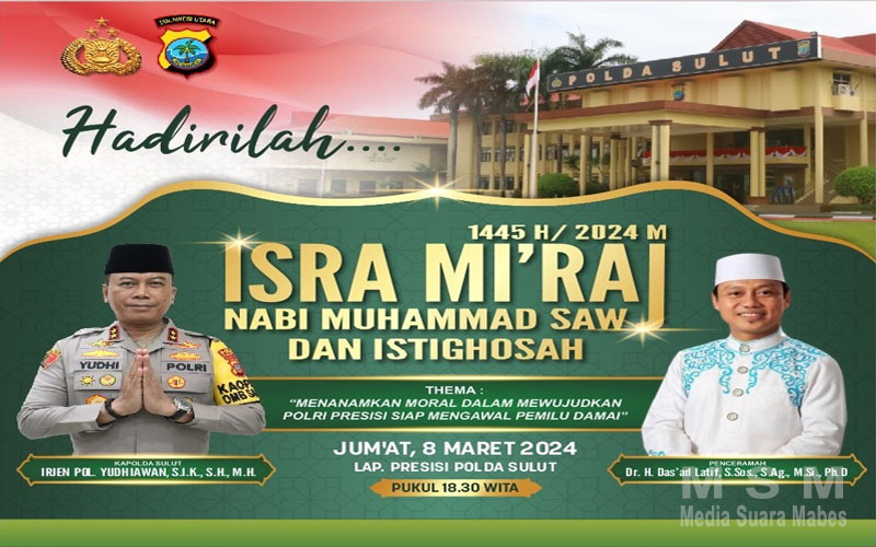 MajalahPerwira, Sulut – Polda Sulawesi Utara akan menggelar peringatan Isra Mikraj Nabi Muhammad SAW 1445 H dan Istighosah, di Halaman Presisi Polda Sulut, pada hari Jumat, 8 Maret 2024 pukul 18.30 Wita.