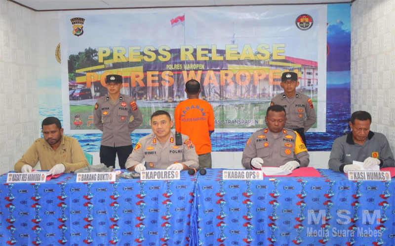MajalahPerwira (Jaringan MSM), Waropen – Sebagai bentuk komitmen pemberantasan narkoba diwilayah hukumnya, Polres Waropen laksanakan Press Release Pengungkapan Peredaran Narkotika Jenis Ganja seberat 51,19 Gram di Ruang Video Conference Mapolres Waropen, Sabtu (01/03/2025).