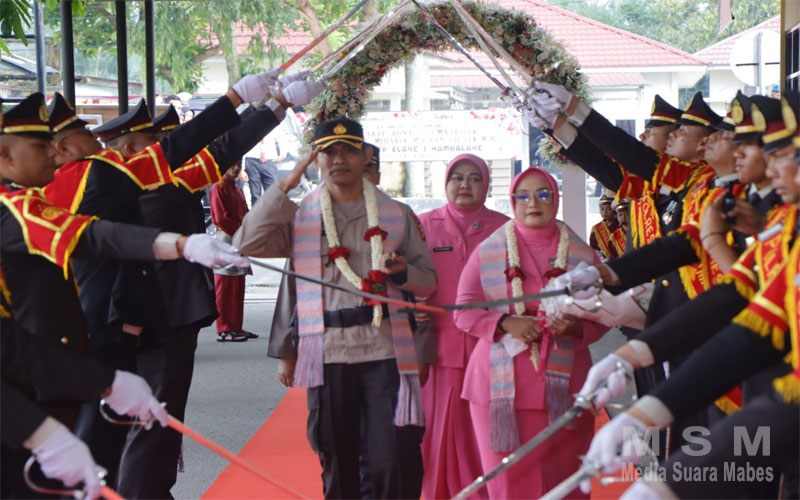 Setelah melewati gerbang pora, keduanya berpamitan sambil menyapa satu persatu personel yang berjejer sepanjang jalan menuju gerbang keluar Polres Kampar. Banyak mata anggota berkaca-kaca saat melepas kepindahan AKBP Ronald Sumaja yang dikenal dekat dengan anggota ini.