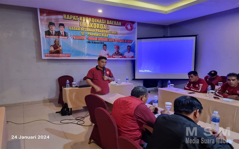 MajalahPerwira, Pekanbaru – Badan Relawan Prabowo (BRP) Riau mengadakan Rapat Koordinasi Daerah (Rakorda) yang berlangsung di Ruang Rapat Tjokro Hotel Pekanbaru. Acara ini dihadiri oleh pengurus inti Dewan Pimpinan Cabang (DPC) BRP se-Riau dan dibuka oleh Ketua BRP DPD Riau, Bapak Faizal Malik, bersama Sekjen BRP Riau, Bapak Herwin MT Sagala, dan Bendahara Umum BRP Riau, Bapak Jesias Kodong.