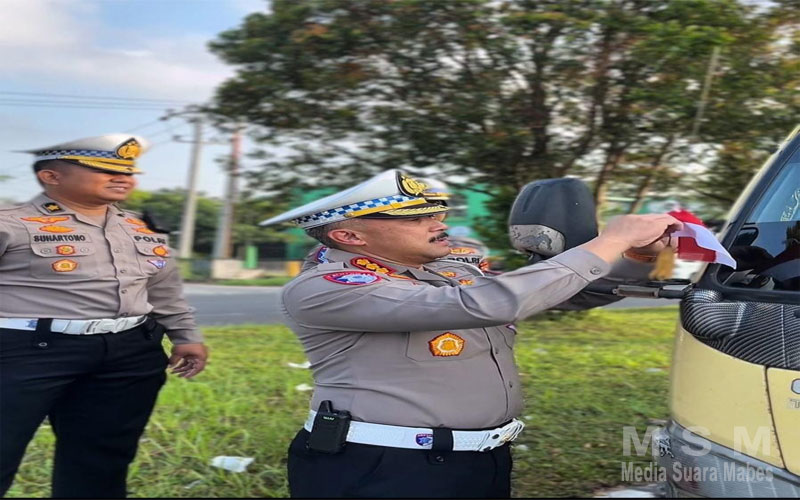 MediaSuaraMabes, Babel – Direktorat Lalu Lintas Polda Bangka Belitung membagikan ratusan bendera merah putih kepada pengendara di simpang lampu merah Air Itam Pangkalpinang.
