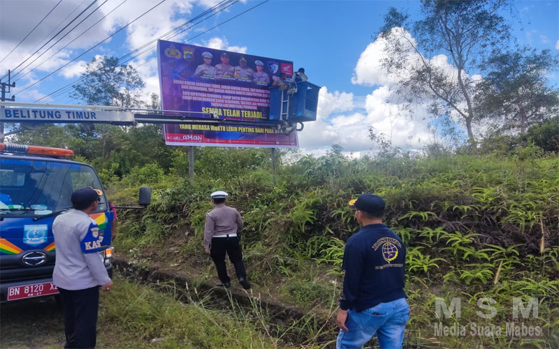 MediaSuaraMabes, Babel – Sat Lantas Polres Belitung Timur melaksanakan kegiatan pemasangan spanduk peringatan keselamatan berlalu lintas di perbatasan wilayah Kab. Belitung Timur dan Belitung, Jum’at(25/04/2025).