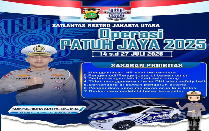 MediaSuaraMabes, Jakarta Utara – Satuan Lalu Lintas (Satlantas) Polres Metro Jakarta Utara menggelar Operasi Patuh Jaya 2025 yang berlangsung mulai 14 hingga 27 Juli 2025. Kegiatan ini dipimpin langsung oleh Kompol Ridha Aditya, S.I.K., M.Si., dengan tujuan meningkatkan kesadaran dan kepatuhan masyarakat terhadap peraturan lalu lintas.