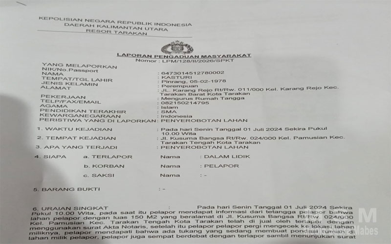 Dugaan tersebut kini telah dilaporkan secara resmi ke Polres Tarakan. Berdasarkan dokumen Laporan Pengaduan Masyarakat yang diterbitkan Kepolisian Resor Tarakan, tercatat sedikitnya empat laporan terkait dugaan penyerobotan lahan di lokasi yang sama, yakni di Jalan Kusuma Bangsa RT 24/RW 000 Kelurahan Pamusian, Kecamatan Tarakan Tengah, Kota Tarakan.