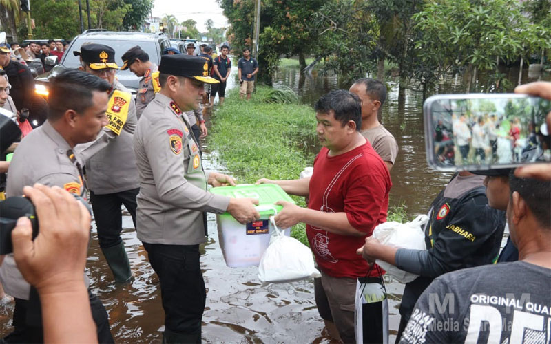 “Ini merupakan salah satu bentuk kepedulian Polda Kalbar bersinergi dengan stakeholder untuk meringankan beban para korban yang terdampak musibah banjir.“ ucap Kapolda Kalbar di lokasi yang tergenang banjir.