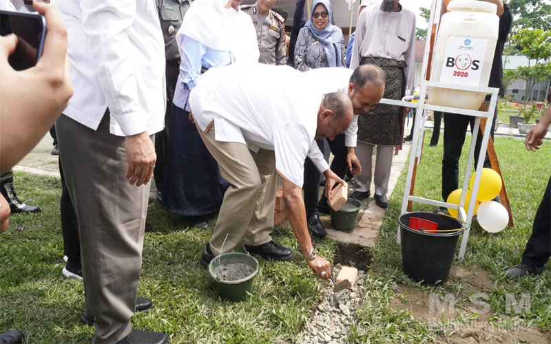 MajalahPerwira, Langkat – Plt Bupati Langkat H. Syah Afandin, SH menghadiri peletakan batu pertama pembangunan Lapangan Futsal dan Pemberian Beasiswa bagi siswa kurang mampu di SMA Negeri 1 Hinai.