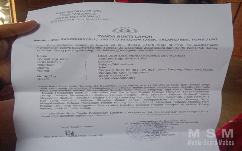 Mendapat perlakuan tidak menyenangkan dan mengalami memar, korban pun membuat laporan kepihak kepolisian polsek talang Padang. Dengan aduan Nomor : STBL GANGGUAN/B-1/150/XI/2023/SPKT/SEK.TALANG/RES.TGMS/LPG.