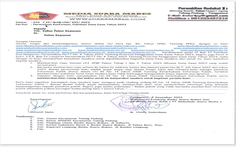 Akhirnya Pewarta Media ini dan kedua rekannya pamit pada Topan dan Yusuf, berharap esok lusa pada jam kerja PNS bisa mendapatkan informasi dari Camat Kecamatan Talang Padang atau ke dinas PMD atau Inspektorat Kabupaten Tanggamus terkait isi surat konfirmasi Media Suara Mabes, di mana hal tersebut dibenarkan dalam UU RI No. 14 Tahun 2008 Tentang Keterbukaan Informasi Publik.