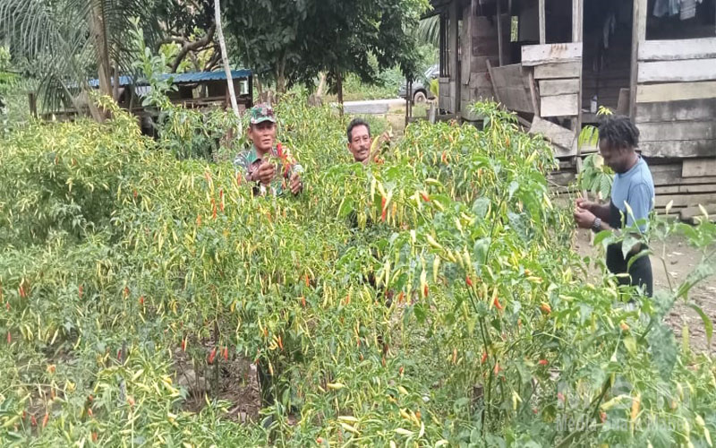 MajalahPerwira, Nabire ~ Untuk meningkatkan ketahanan pangan di wilayah binaan,Babinsa Pos Ramil Lembah Jago Koramil Koramil 1705-03/Kwatisore (Serka Sigit Suryono, saat turun ke kebun dan berikan motivasi kepada petani cabai, kebun milik Bapak Anjas yang bertempat di Kampung Yaur Distrik Yaur,Kabupaten Nabire Provinsi Papua Tengah.