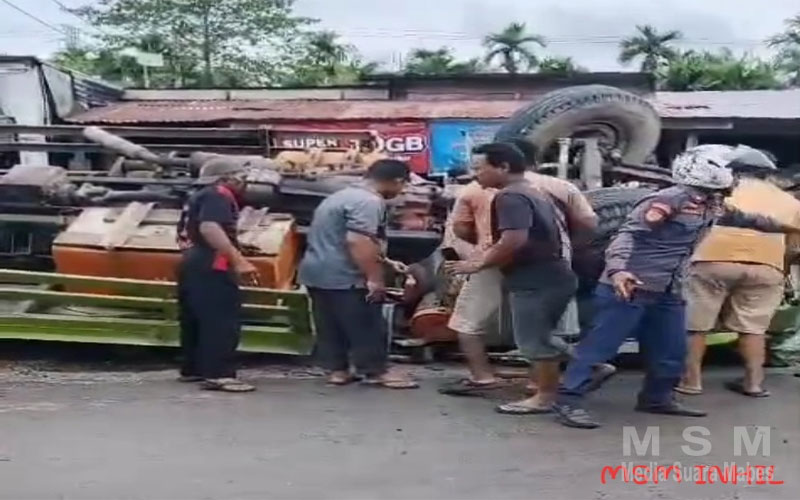 MajalahPerwira (Jaringan MSM), Kab. Indragiri Hilir – Sebuah truk pengangkut kendaraan berat mengalami kecelakaan di Simpang 3, tepat setelah turun dari Jembatan Rumbai, Kabupaten Indragiri Hilir (Inhil), Selasa siang (25/2). Akibat kejadian ini, sang sopir dikabarkan terjepit di dalam kabin truk.